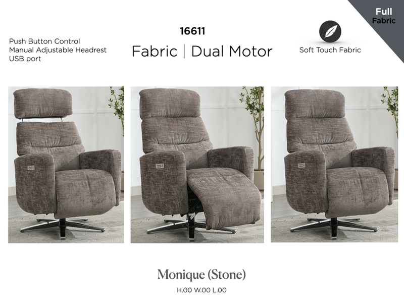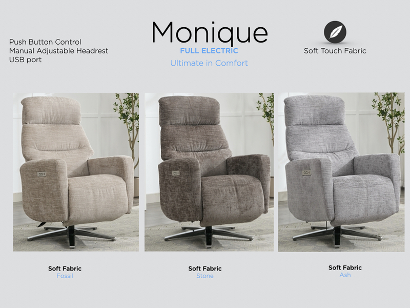 Elevate your relaxation experience with our Monique Electric TV Chair, featuring a powerful dual motor system for customisable comfort. Available in the elegant fabric colours of Fossil, Stone and Ash, this chair not only enhances your living space but also provides the perfect support. With its sleek design and sophisticated hues, the Monique seamlessly blends functionality with style, allowing you to adjust your seating position effortlessly. Indulge in a world of comfort and make your leisure time truly enjoyable. A manual adjustable headrest and USB port are included.Elevate your relaxation experience with our Monique Electric TV Chair, featuring a powerful dual motor system for customisable comfort. Available in the elegant fabric colours of Fossil, Stone and Ash, this chair not only enhances your living space but also provides the perfect support. With its sleek design and sophisticated hues, the Monique seamlessly blends functionality with style, allowing you to adjust your seating position effortlessly. Indulge in a world of comfort and make your leisure time truly enjoyable. A manual adjustable headrest and USB port are included.