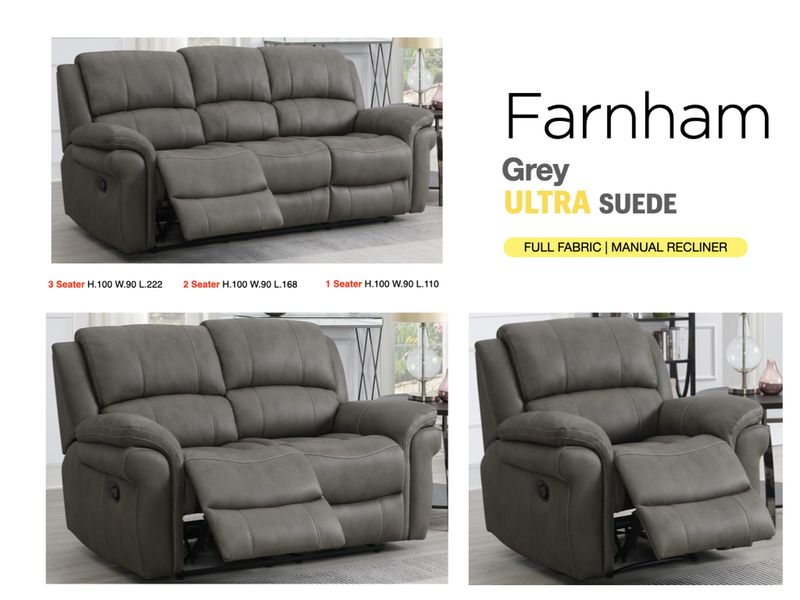 Experience the perfect blend of timeless elegance and cutting-edge comfort with the all-new Farnham Ultra Reclining Suite. Available in both manual and electric reclining options, this suite is crafted to deliver relaxation with style.Wrapped in next-generation fabric for a luxurious feel and enhanced durability, the Farnham Ultra comes in two versatile shades – Tan and Grey – to complement any living space.Designed with a high-rise back and pocket sprung seat cushions, this suite offers superior lumbar support and all-day comfort. Whether you're lounging, reading, or catching up on your favourite shows, you'll feel the difference.The USB port built into the electric versions ensures your devices stay charged while you unwind. With its traditional design and a stylish modern twist, the Farnham Ultra is available in a 3-seater, 2-seater, and armchair – the perfect fit for any home.Experience the perfect blend of timeless elegance and cutting-edge comfort with the all-new Farnham Ultra Reclining Suite. Available in both manual and electric reclining options, this suite is crafted to deliver relaxation with style.Wrapped in next-generation fabric for a luxurious feel and enhanced durability, the Farnham Ultra comes in two versatile shades – Tan and Grey – to complement any living space.Designed with a high-rise back and pocket sprung seat cushions, this suite offers superior lumbar support and all-day comfort. Whether you're lounging, reading, or catching up on your favourite shows, you'll feel the difference.The USB port built into the electric versions ensures your devices stay charged while you unwind. With its traditional design and a stylish modern twist, the Farnham Ultra is available in a 3-seater, 2-seater, and armchair – the perfect fit for any home.