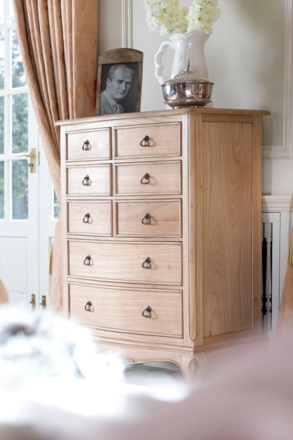 Traditionally crafted Louis style bedroom pieces. Made from solid mindi wood with a subtle grain, hand carved details and finished in a soft, golden lacquer. This stunning collection brings a timeless elegance touched with a little decadence.